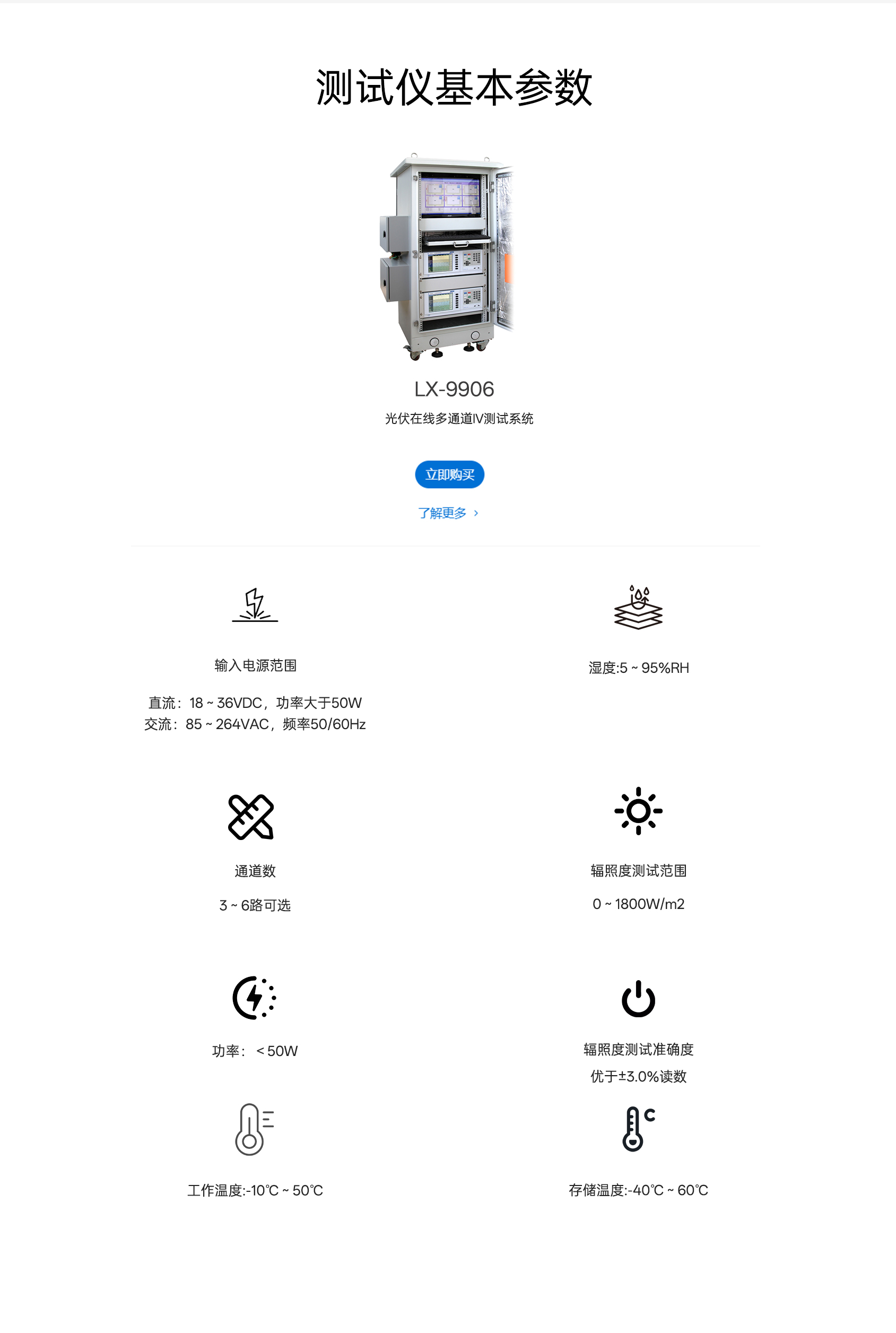 LX9906光伏在線多通道IV測試系統具備自主測試和顯示能力,提供真6路電子負載,提供多至6通道的實時同步測試能力,并可根據用戶需求訂制通道數量及測試模塊的測試功率。
