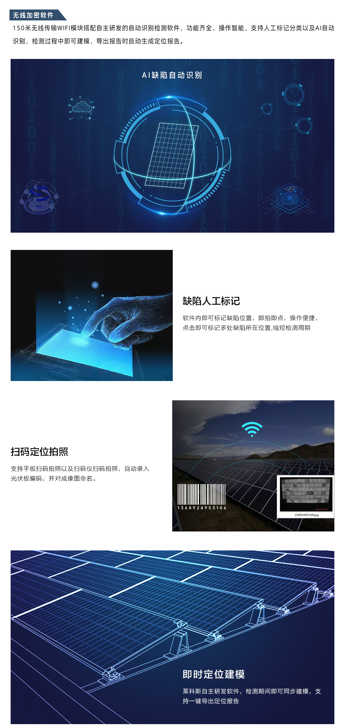 針對漁光互補(bǔ),農(nóng)業(yè)大棚,山地電站,常規(guī)的拍照性EL檢測儀已經(jīng)遠(yuǎn)遠(yuǎn)無法達(dá)到市場檢測需求,操作難,作業(yè)危險(xiǎn)成為了主要障礙。經(jīng)過LAILX多年努力,LAILX突破了光伏EL缺陷檢測掃描性檢測難點(diǎn)。萊科斯最新研發(fā)生產(chǎn)的《EL掃描儀》可實(shí)現(xiàn)電池片/電池板/方陣組件的局部與大面積掃描性檢測,檢測畫面視頻實(shí)時(shí)同步傳輸,多種操作方式可快速完成大面積的電池板EL內(nèi)部缺陷檢測。